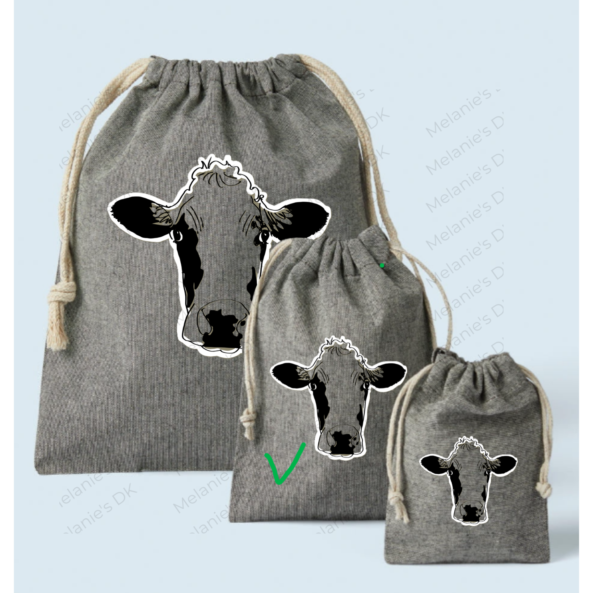 Eigen ontwerp, twee kleuren koeienkop, bedrukt op een leuk klein trekkoord tasje (stuffbag).
