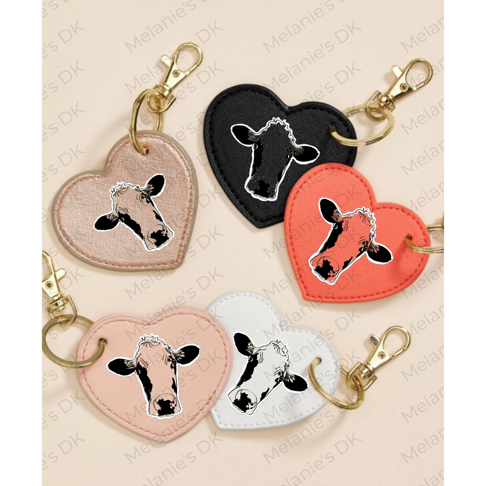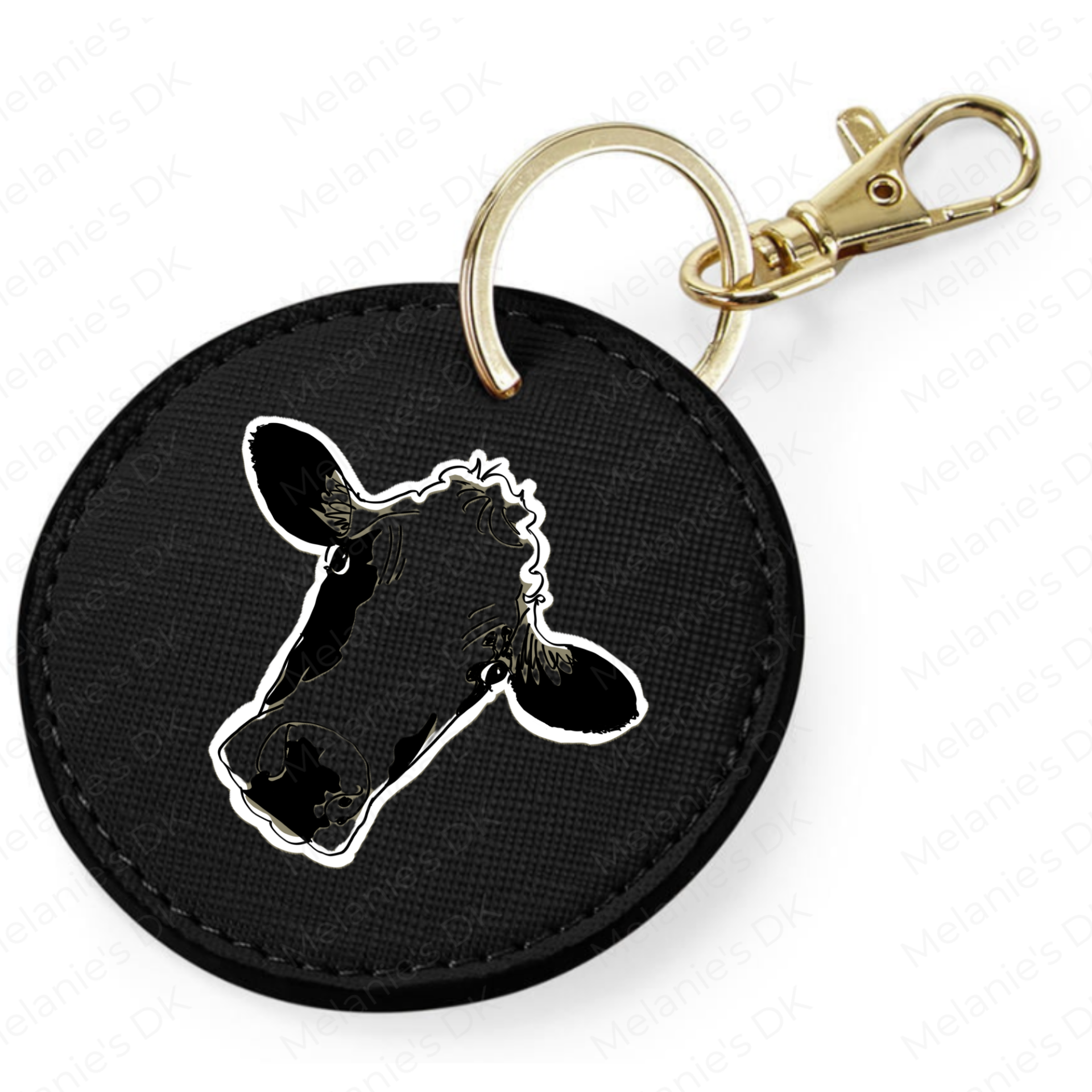Eigen ontwerp, twee kleuren koeienkop, bedrukt op een keyclip. Leuk om aan een tas te hangen, of als sleutelhanger.
