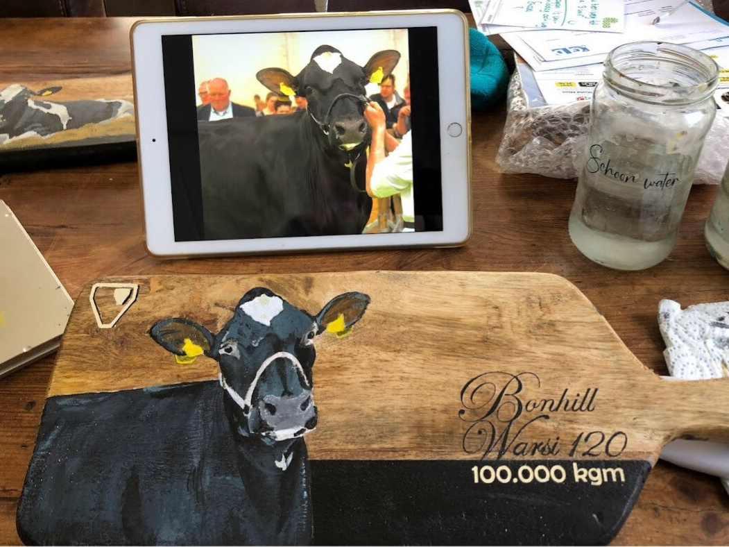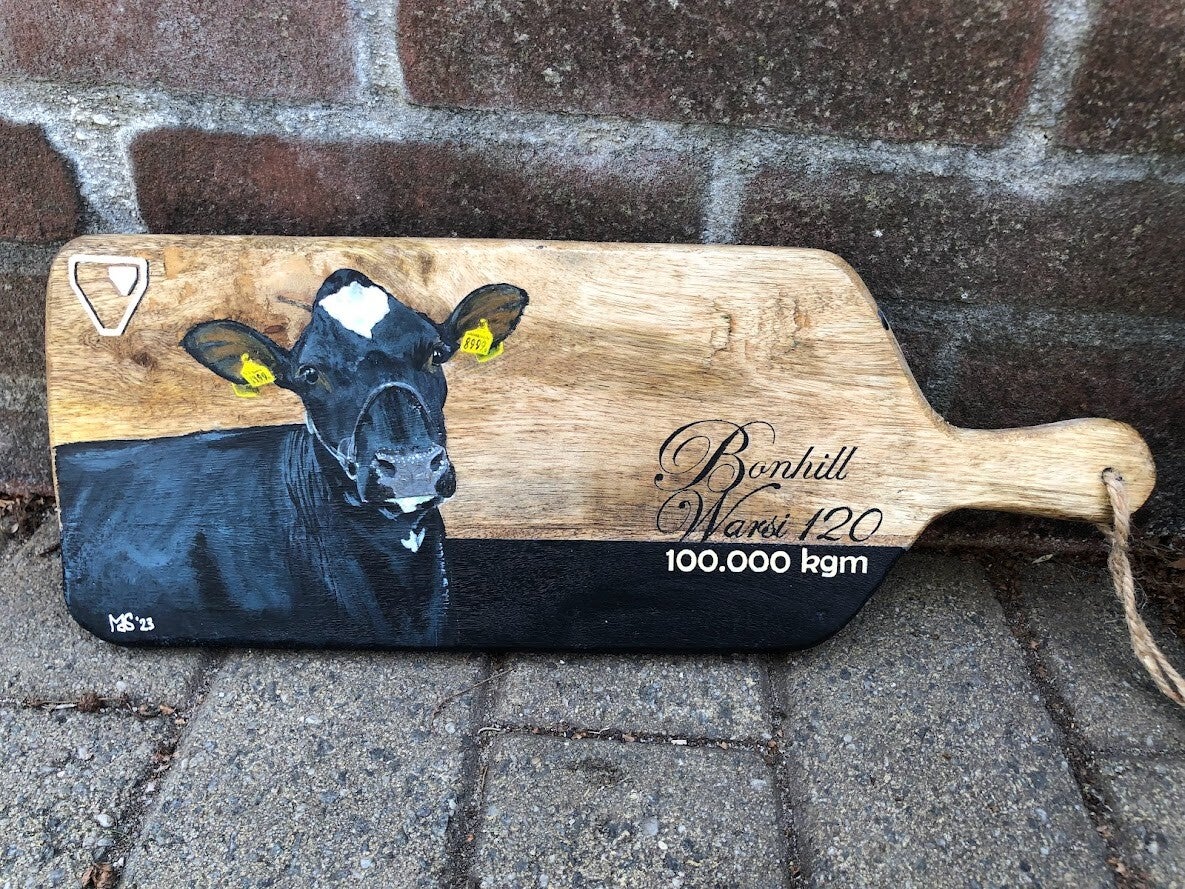 Hieronder laat ik een 'making-of' zien van een werk in opdracht. Ik kies even zo'n koe uit, die ik op de borrelplankjes schilder