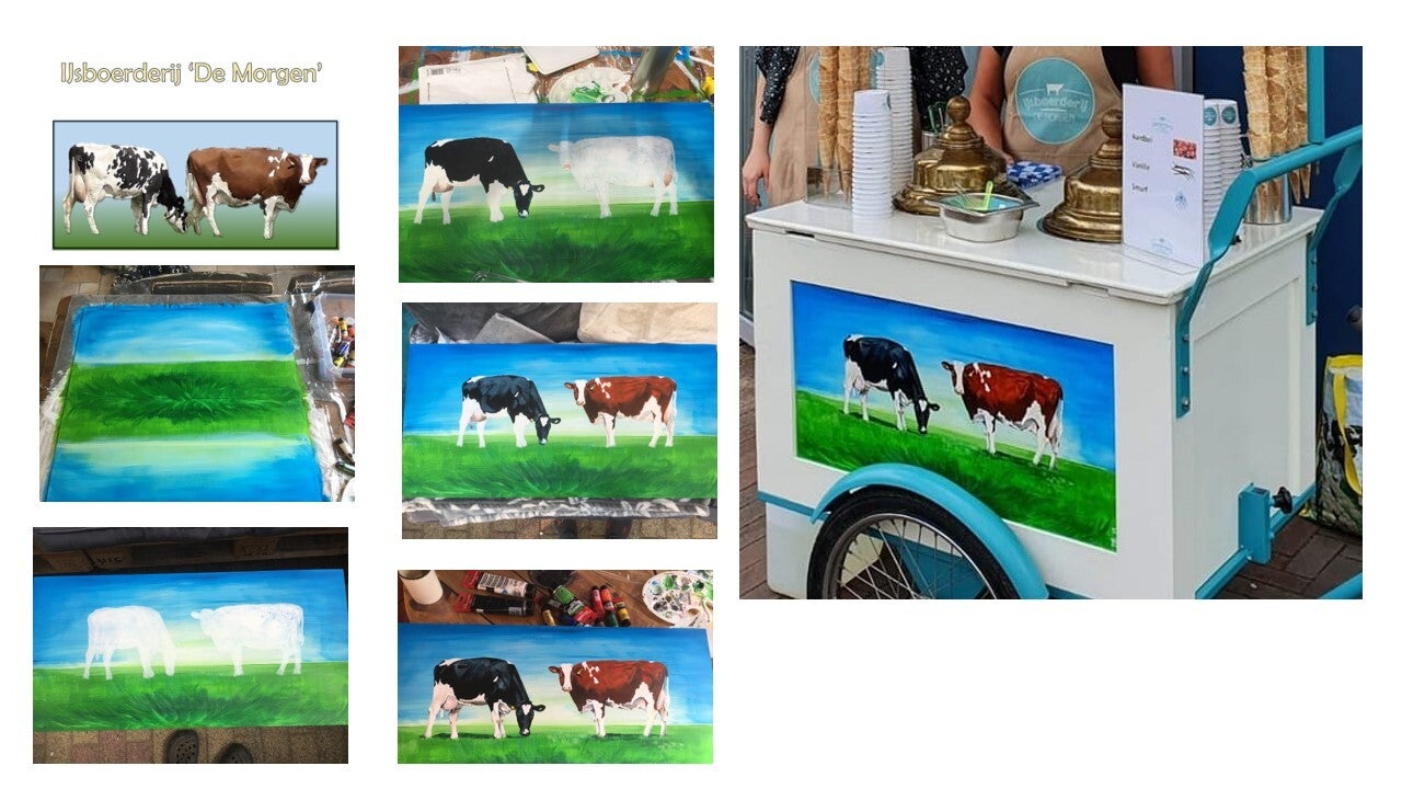 Hieronder de 'making-of' van de ijskar van Boerderij De Morgen (Montfoort). Dit is de ene kant, aan de andere kant staan (...) 2 liggende koeien. Allemaal de koeien van de boerderij zelf. Hoe cool is dat? Dit is op een trespa-plaat geschilderd (die heeft eerst een speciale primer nodig).